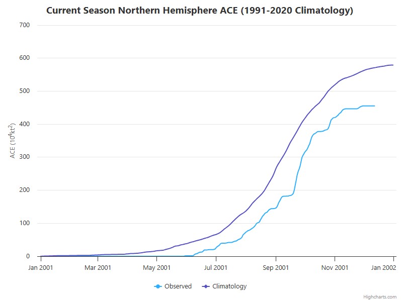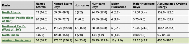 The charts below are National Hurricane Center/Joint Typhoon Warning Center data as tabulated by Colorado State University.