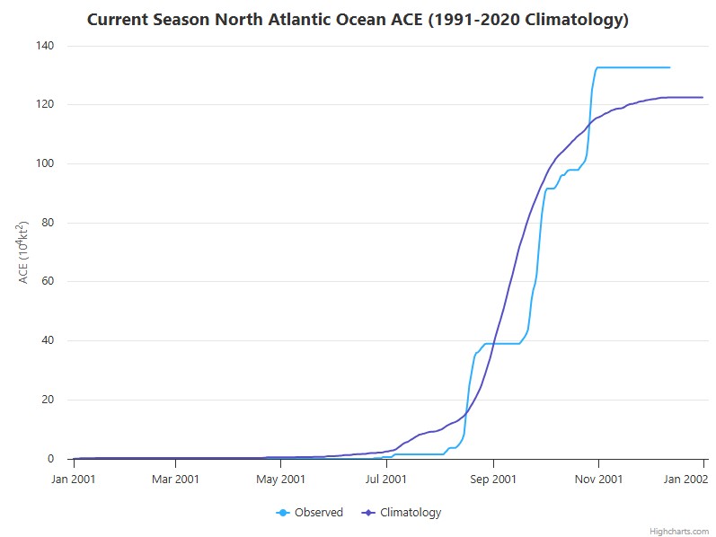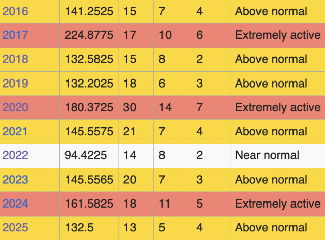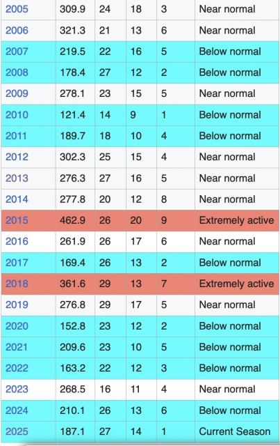 First of all, and I reviewed this earlier, the centering of the ACTUAL HIGHEST ACE RELATIVE TO AVERAGE this year, wound up about 350 miles east northeast of what we had as our idea. I have stated that the whole numbers game adds up to nothing; it’s who gets hit that really counts. But the numbers game is what everyone focuses on. It’s like pickleball to real tennis to me. So our impact forecast was overdone for the US, unlike last year, which was issued further out. The reason is simple. I thought the congregation of tracks would be further west. Even with that, the amount of damage from non-named storms and the ones offshore to the beaches was quite high. North Carolina had 16 houses fall into the sea. In 2011, when Category 2 Irene hit the NC coast, only 6 houses fell into the sea. So the unnamed storms, one of them that should have been named, did their dirty work this year