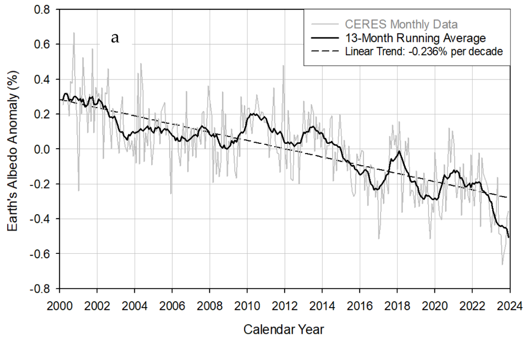 The figure below shows CERES measurements of global albedo from 2000 to 2024, expressed as a percentage anomaly of the 2001 to 2022 mean. The albedo decrease since 2000 is approximately 0.79%, which implies an increase in absorbed shortwave solar radiation of 2.7 watts per square meter over that period. The two researchers point out that this absorption is very close to the total anthropogenic forcing of 2.72 watts per square meter from 1750 to 2019 estimated by the IPCC (Intergovernmental Panel on Climate Change) in its AR6 (Sixth Assessment Report).