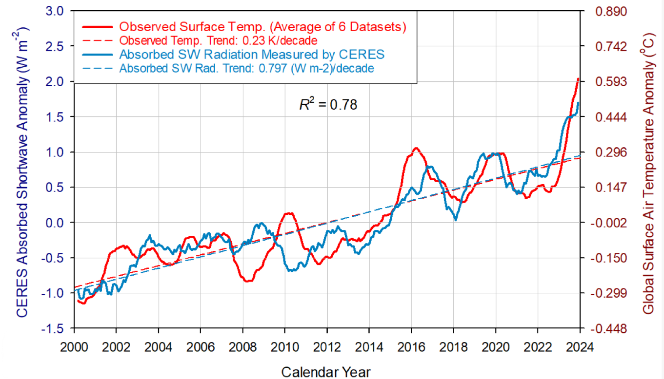 The next figure shows CERES measurements of absorbed shortwave radiation from 2000 to 2024 along with global surface air temperature, measured as the average of six temperature datasets (HadCRUT5, GISTEMP4, NOAA Global, BEST, RSS and NOAA STAR). The temperature anomaly tracks changes in the absorbed solar flux with an average lag of approximately 4 months. Nikolov and Zeller say this close empirical relationship suggests that temperature is directly controlled by the absorbed solar flux.