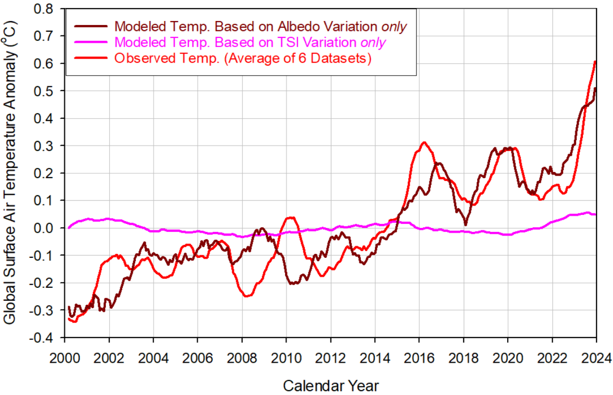 The researchers quantify the individual effects of albedo and TSI on surface temperatures by using their semiempirical mathematical model. The following figure compares modeled temperatures based on each of these two factors with observations. It’s clear that variations in TSI play only a minimal role while variations in albedo dominate the temperature trend.