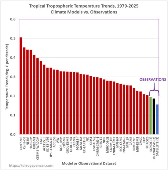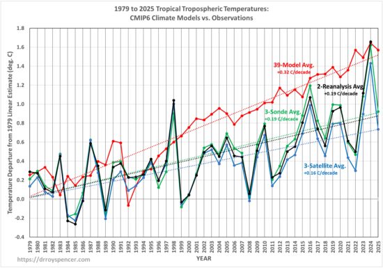 As a follow-on to my recent post regarding global surface air temperature trends (1979-2025) and how they compare to climate models, this is an update on a similar comparison for tropical tropospheric temperature trends, courtesy of tabulations made by John Christy. It also represents an update to my popular “epic fail” blog post from 2013.