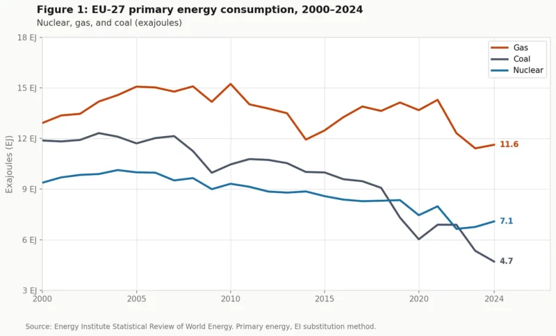 Bulgaria y Lituania cerraron centrales como condición para su adhesión a la UE. Alemania cerró ocho reactores inmediatamente después de Fukushima en marzo de 2011 y clausuró su último reactor operativo en abril de 2023. Suecia cerró cuatro de sus doce reactores comerciales. Francia empezó a replantear su compromiso con la energía nuclear. En 2024, el parque nuclear de la UE-27 contaba con 100 reactores. El consumo nuclear descendió desde un máximo de 10,1 exajulios (EJ) en 2004 hasta 7,1 EJ.