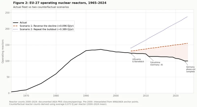 Entre 1970 y 1990, el consumo nuclear en la UE pasó de 0,18 EJ a 7,95 EJ, es decir, aumentó en 0,39 EJ al año. ¿Y si ese mismo ritmo de crecimiento se hubiera mantenido desde el máximo de 2004? En 2024, la UE habría contado con unos 238 reactores produciendo 17,9 EJ. Esto habría supuesto un aumento de 10,8 EJ respecto a lo ocurrido en realidad, aproximadamente el doble del consumo nuclear alcanzado en 2004. Este escenario habría requerido un compromiso político similar al de Francia en los años setenta, con unos siete nuevos reactores entrando en funcionamiento cada año.