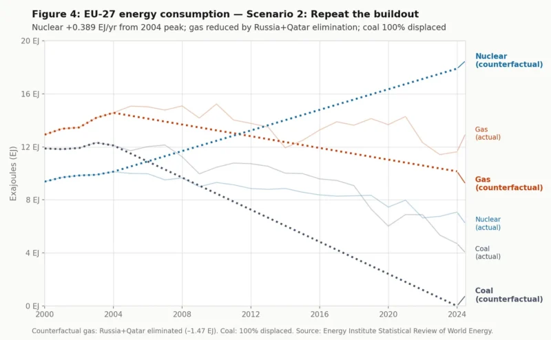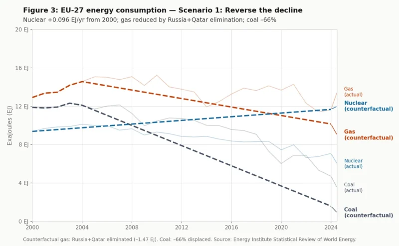 El consumo de energía nuclear en la UE-27 disminuyó en 0,096 EJ al año entre 2000 y 2024. ¿Y si, en lugar de disminuir, hubiera crecido a ese mismo ritmo? Partiendo de 9,4 EJ en 2000 y sumando 0,096 EJ anuales, la energía nuclear habría alcanzado 11,7 EJ en 2024, lo que equivale aproximadamente a 155 reactores en funcionamiento. Este escenario supone un aumento de 4,6 EJ en el consumo nuclear de la UE-27 en comparación con lo ocurrido en realidad.