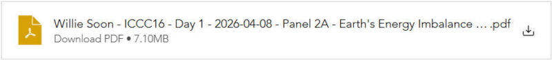 In seinem Vortrag hob er auch die Rolle von CERES hervor, das 2018 gemeinsam mit Willie Soon gegründet worden war, und wie die wissenschaftliche Forschung von CERES dieses Modell verkörpert: Wissenschaft, die von Neugierde und nicht von Fördermitteln angetrieben wird und bis heute (13. April 2026) 44 begutachtete Artikel und 174 Mitautoren mit unterschiedlichen Standpunkten hervorgebracht hat.