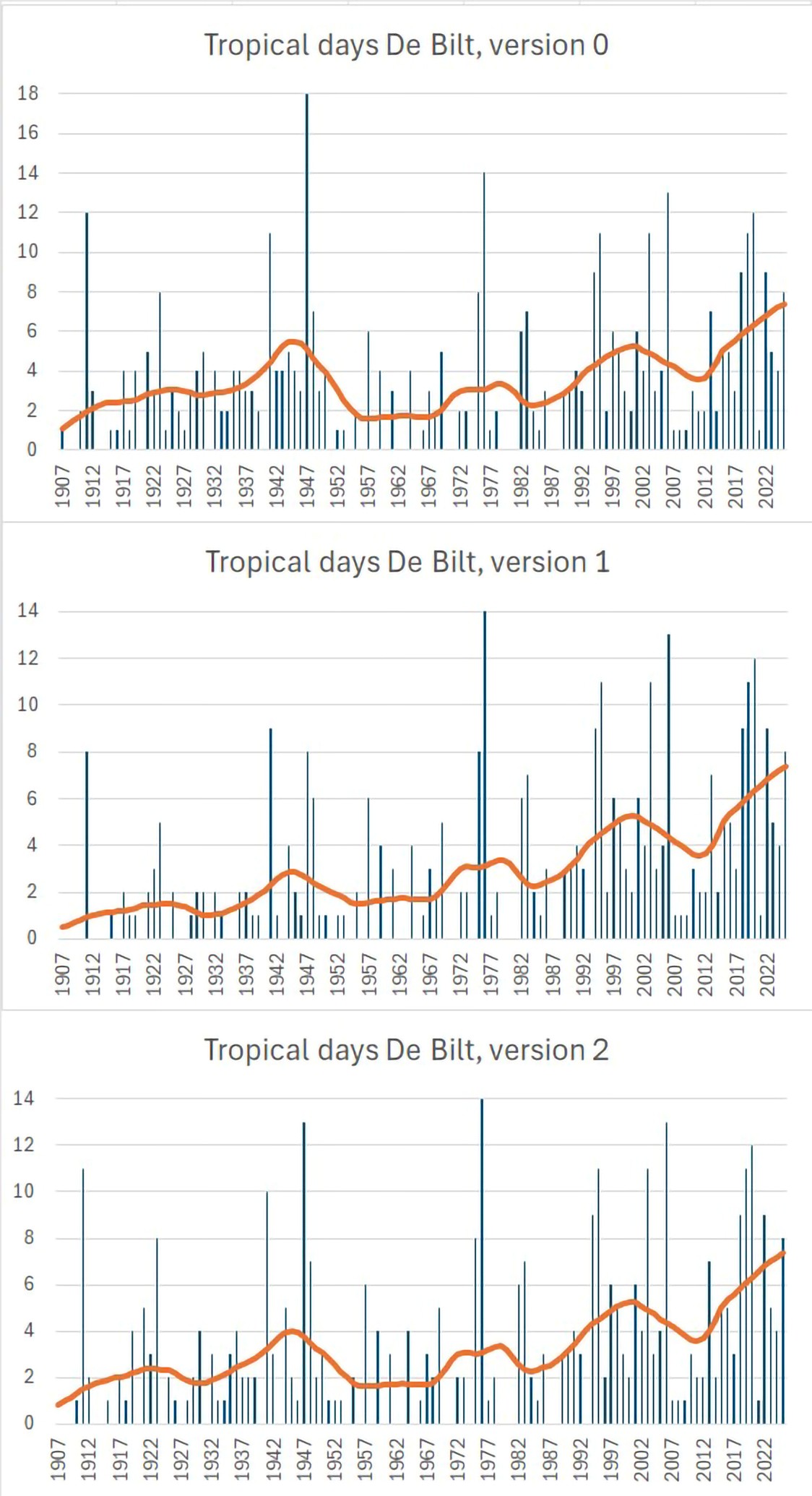 Tropical days at De Bilt, version 0, 1 and 2 (staves) with non-linear trendline (orange solid line).