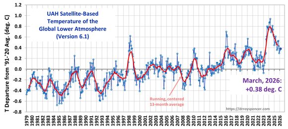 Die globale Temperatur ist im März 2026 gegenüber Februar etwa gleichgeblieben. Sie liegt nun um 0,38 Grad Celsius höher als das langjährige Mittel. Der Abkühlungstrend neigt sich dem Ende und es deutet sich ab Herbst ein El-Nino an, der die globalen Temperaturen im nächsten Jahr erhöhen wird. El Nino ist eine natürliche zyklische Erwärmung des tropischen Pazifiks, die sich alle 3-5 Jahre ereignet. Das hat zwar nichts mit CO2 zu tun, aber wir werden erleben, wie Politik und Medien die steigenden Temperaturen zum Anlass nehmen werden, ihren fatalen Weg der Energiewende damit weiter zu begründen.