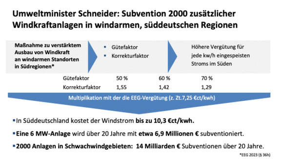 Worum geht es? Im Erneuerbaren-Energie-Gesetz (EEG) hatte Robert Habeck den § 36h hinzugefügt. Weil mit der normalen EEG-Vergütung niemand auf die Idee käme, im windschwachen Bayern, Baden-Württemberg, Südhessen und südlichen Rheinland-Pfalz ein Windkraftwerk zu errichten, weil es sich nicht rechnet, wurde ein Korrekturfaktor ins Gesetz eingebracht, der die EEG-Vergütung für den Süden auf das 1,55-fache erhöht, wenn der Wind nur 50 % des bundesdeutschen Referenzstandortes ausmacht. Wenn es nur 60 % sind, erhöht sich der Zuschlag um “nur”  das 1,42-fache, bei 70 % das 1,29-fache. Es ist wie bei den Schildbürgern: dort, wo wenig Wind ist, ist Windenergie besonders unwirtschaftlich und deswegen bezahlt der Steuerzahler mehr.