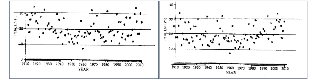 Les deux graphiques sont identiques, à ceci près que l’un est inversé (de gauche à droite), le temps augmentant vers la gauche. (En y regardant de plus près, vous constaterez qu’ils sont symétriques.) J’affirme que si vous ne parvenez pas à distinguer le graphique correct de celui dont le temps est inversé, alors l’augmentation récente de la fréquence des phénomènes météorologiques extrêmes, telle que décrite par Lubchenco et Karl, n’est pas clairement étayée par leurs données. Lubchenko et Karl prétendent même que l’un de ces graphiques prédit une catastrophe climatique imminente ! Seriez-vous vraiment prêt à parier des milliards de dollars pour identifier celui qui prédit cette catastrophe ?