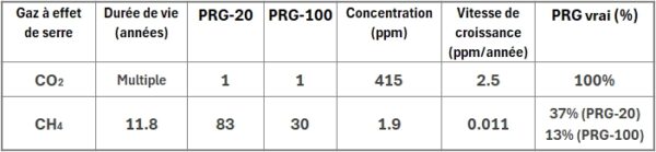 Le potentiel de réchauffement global (PRG) conventionnel est une mesure sans dimension, créée par le GIEC (Groupe d’experts intergouvernemental sur l’évolution du climat) des Nations Unies, dans laquelle le PRG par molécule d’un gaz à effet de serre donné est normalisé par rapport à celui du CO₂. Le PRG tient compte de la durée de vie atmosphérique du gaz. Le tableau ci-dessous présente le PRG-20 et le PRG-100, les potentiels de réchauffement calculés sur un horizon temporel de 20 ans et de 100 ans, respectivement, pour le CO₂ et pour le CH4.