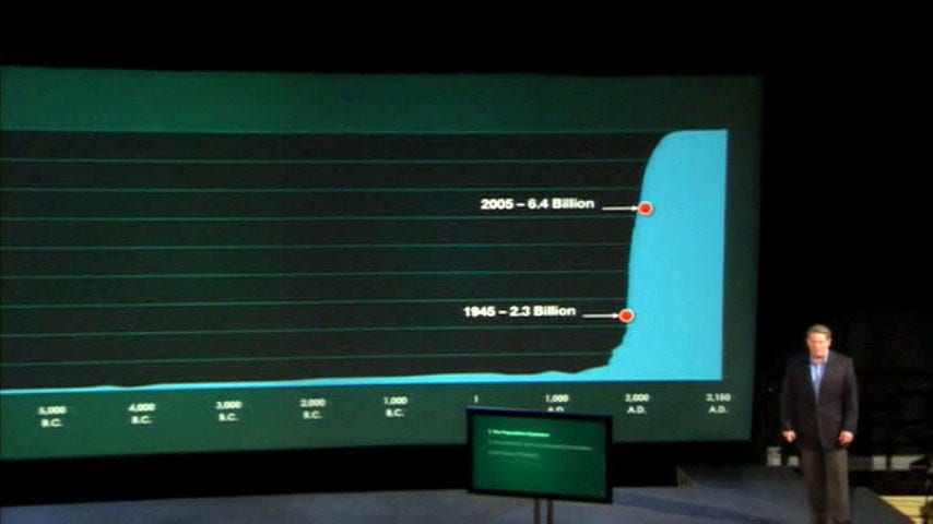Al Gore présentant son célèbre diaporama vers 2006. Ici, il montre un graphique de la population mondiale.
