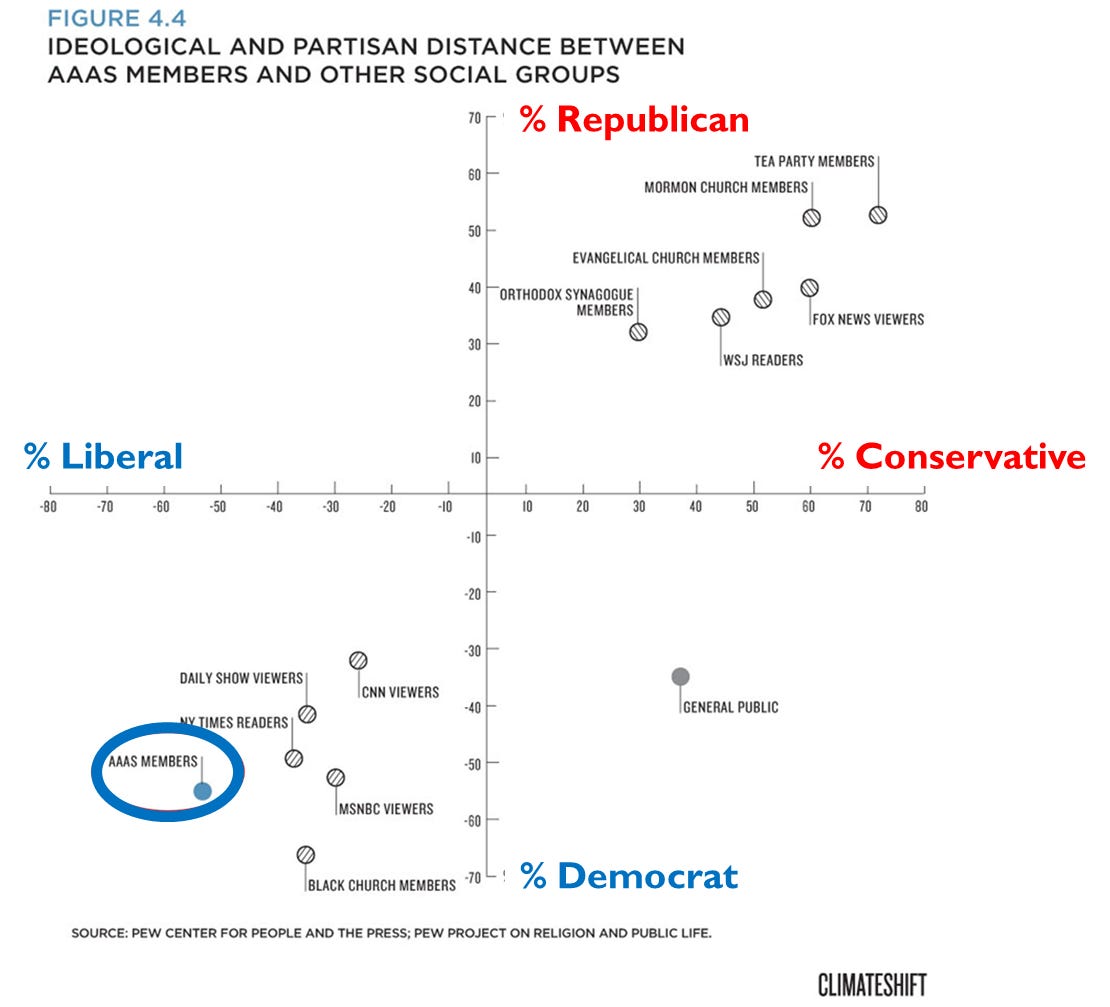 L’ouvrage « Climate Shift » de Matt Nisbet contribue à expliquer pourquoi les scientifiques de l’AAAS ont été si réceptifs au message de Gore. En 2009, plus de 50 % des membres de l’AAAS se déclaraient libéraux ou très libéraux, contre seulement 9 % de conservateurs, et 55 % se disaient démocrates contre seulement 6 % de républicains.
