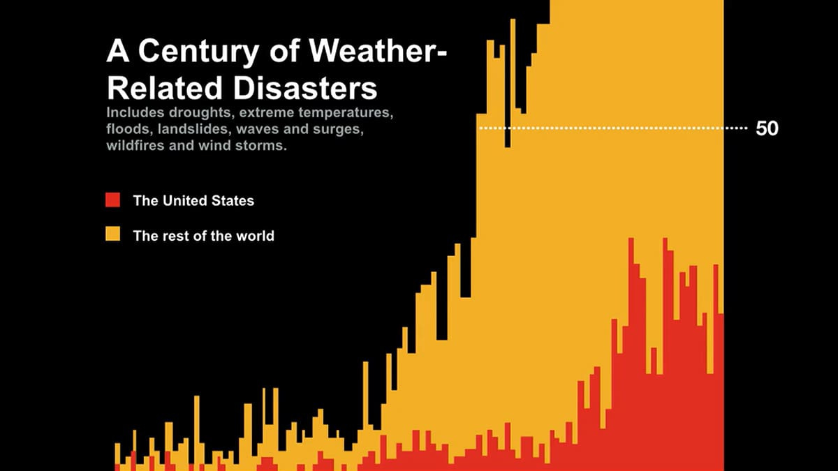 Pour sa conférence à l’AAAS, Gore avait mis à jour son célèbre diaporama du film original avec de nouvelles diapositives. Vers la fin de son intervention, il a présenté un graphique du Centre de recherche sur l’épidémiologie des catastrophes (CRED) illustrant une augmentation spectaculaire des catastrophes liées aux conditions météorologiques. Il s’en est servi pour affirmer que le changement climatique provoquait déjà des « catastrophes météorologiques totalement inédites »¹. Un extrait de cette diapositive est visible ci-dessus.