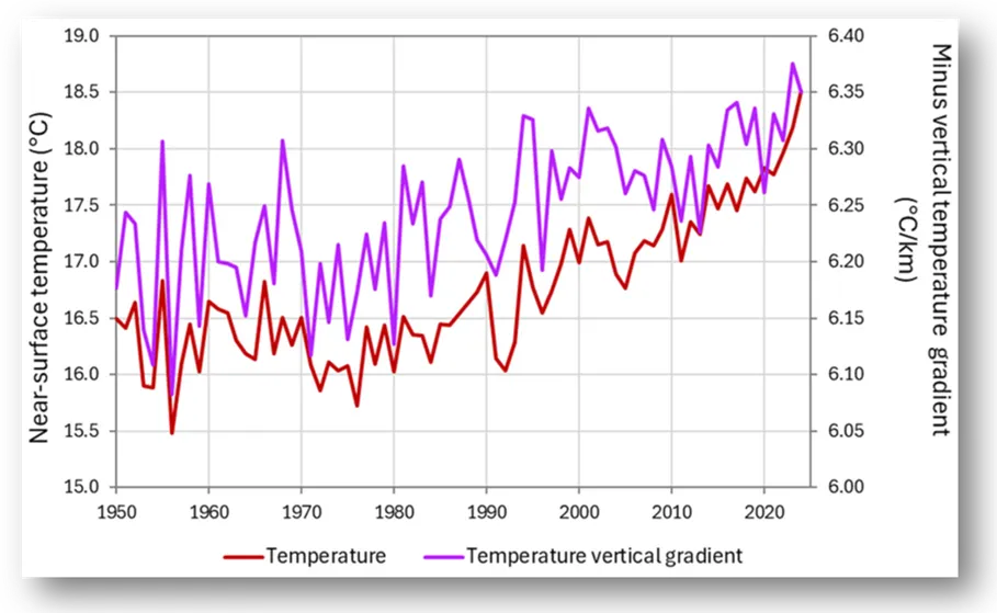- Q2: How has the vertical temperature structure of the Mediterranean atmosphere evolved during 1950–2024, and what does the resulting change in the lapse rate reveal about the distribution of warming across atmospheric layers?