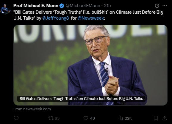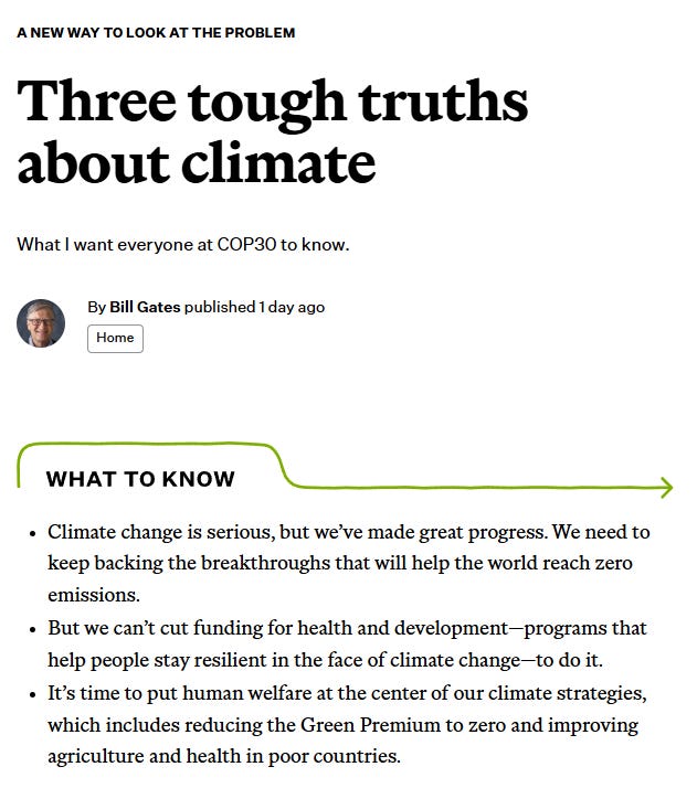 All these existential threats live in hypothetical models built on shaky assumptions, as I’ve discussed repeatedly. Now, even Gates seems to be reading the room, or perhaps my Substack, and acknowledging the grift is up. But why the shift? There’s no new data justifying it; observations haven’t suddenly changed. This could be Gates seeing the writing on the wall, or a UN salvage operation to pivot from failed climate goals to real issues like poverty and health.