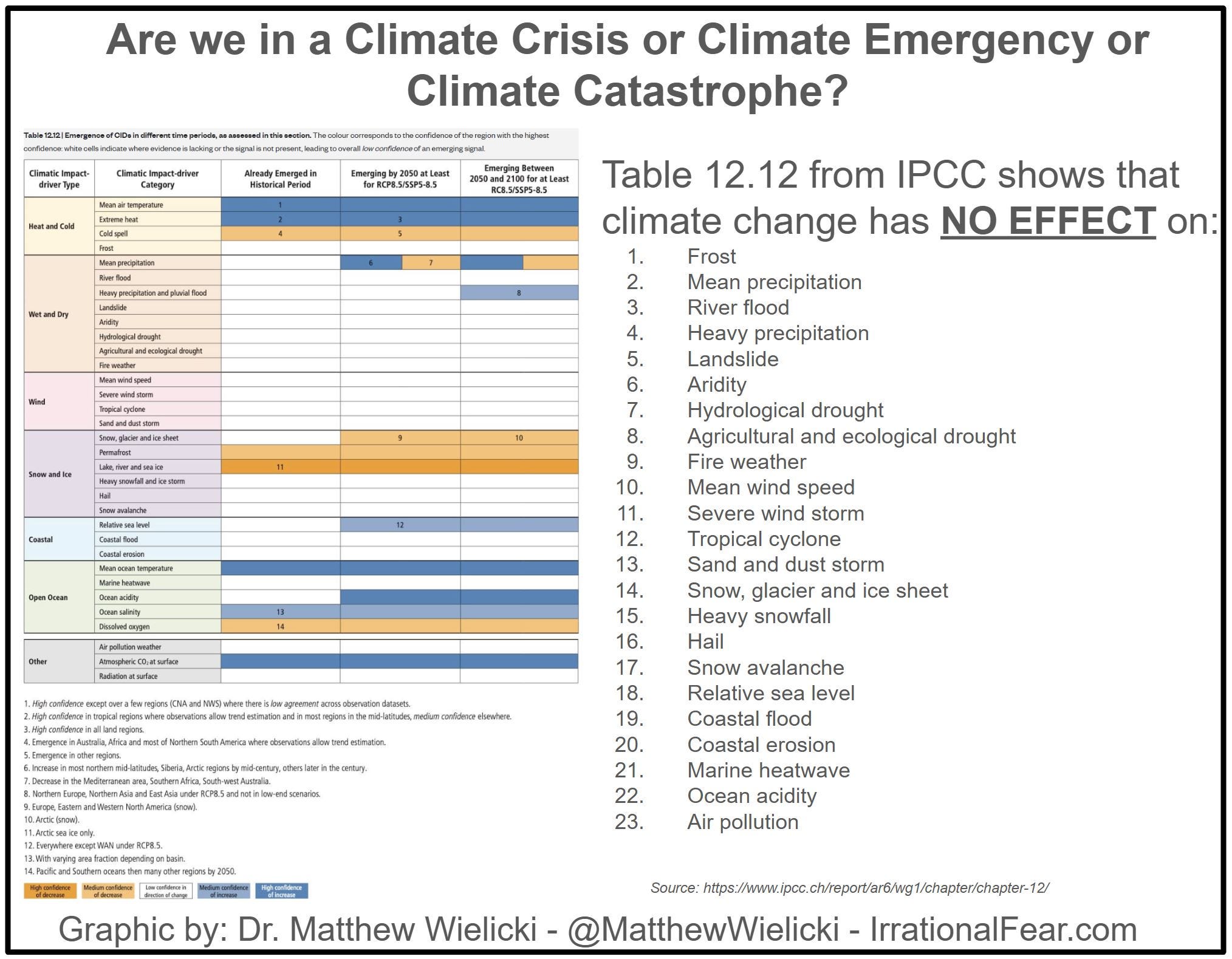 As I’ve argued extensively on Irrational Fear, the real “threat” was never modest warming of 1.5–2°C itself. It was always the hyped-up feedback loops: supercharged hurricanes, catastrophic sea-level rise flooding islands, disrupted food systems leading to famine, and billions migrating as climate refugees. Yet, none of this has materialized. In fact, the latest IPCC report’s Table 12.12 (from AR6, 2021) paints a clear picture: white cells dominate categories like tropical cyclones, mean precipitation, fire weather, and more, indicating no detectable emerging signal or trend in either direction.