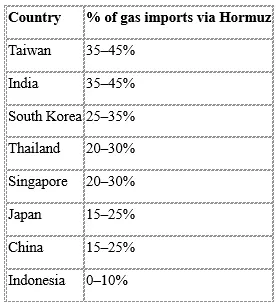 The table below shows the extent of Asia’s heavy dependence on oil and gas imports delivered via the Strait of Hormuz.