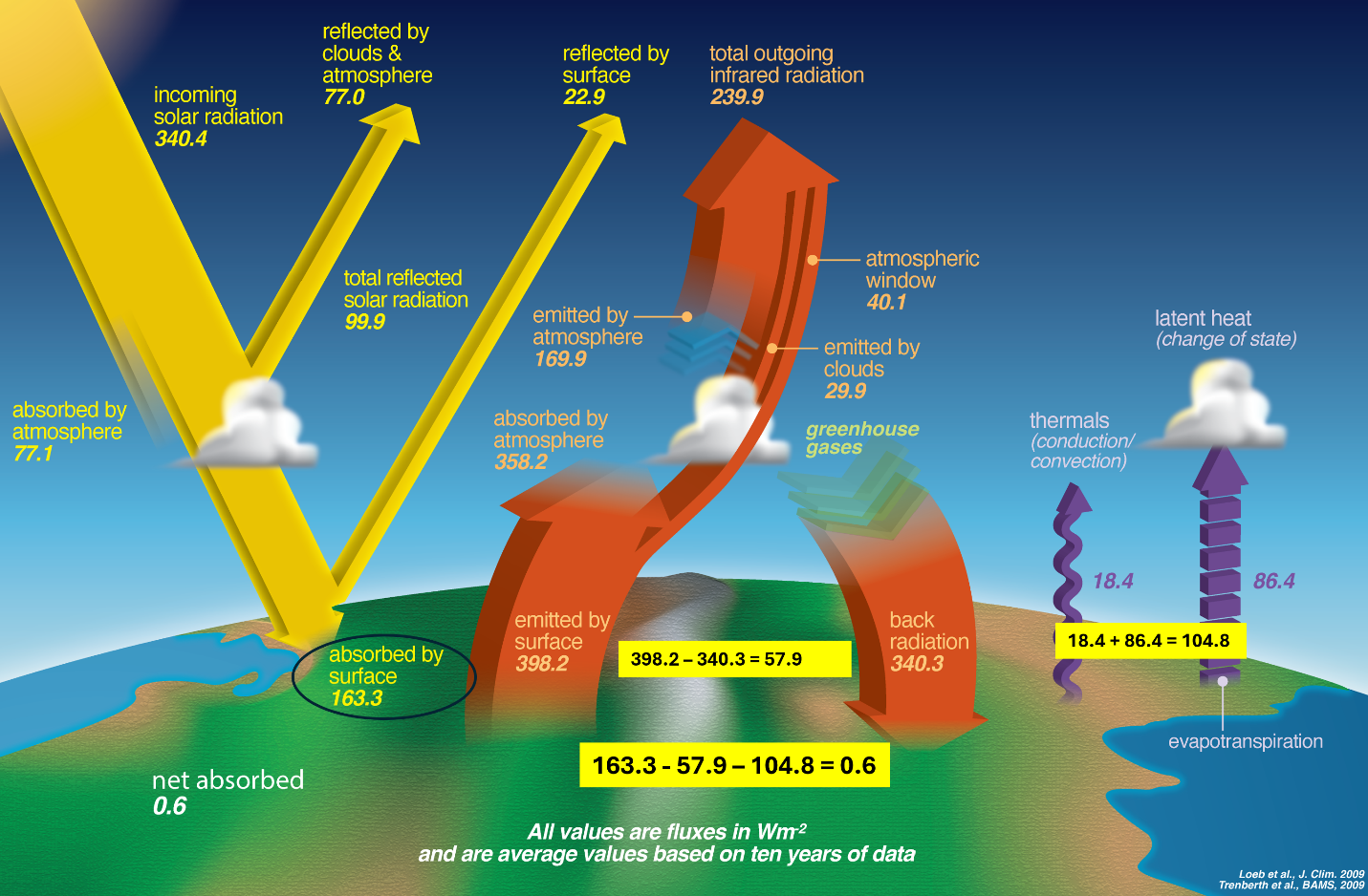 Figure 1. NASA energy flow diagram. It illustrates a TOA and surface energy imbalance of 0.6 W/m2.