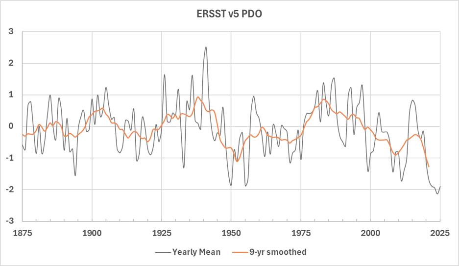 Figure 2. The PDO index from the ERSST v5 dataset. Both the year-to-year index is displayed and the 9-year smoothed index. Data from here.
