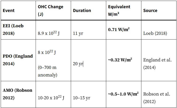 Loeb et al.’s 2018 estimate of the TOA Earth Energy Imbalance is 0.71 W/m2. When this is expressed in terms of Ocean Heat Content (OHC) it is roughly 8.9 x 1022 Joules. Loeb et al. assume that OHC can be used to set a TOA EEI absolute value, like Fasullo, Trenberth and others do, to calibrate their satellite incoming and outgoing radiation measurements. However, upper ocean heat content has more drivers than TOA EEI, especially over the long-term (>10 years). TOA EEI is just incoming and outgoing radiation flux, ocean surface flux is also a function of evaporation, wind speed, and direction. These latter factors manifest themselves as the major climate oscillations, especially the AMO and PDO. Table 1 shows the impact of AMO and PDO climate oscillations compared to Loeb et al.’s assumed TOA EEI of 0.71 W/m2. Which is a function of OHC data, his “in-situ value” (Johnson et al., 2016):