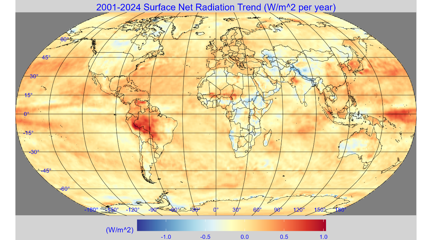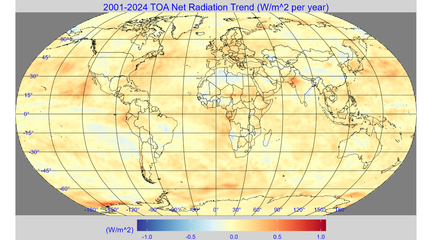 We used the CERES EBAF data to map the TOA net radiation trend from 2001-2024 for the globe, the map is shown in figure 4. Much of the map is near zero (light yellow), but there are areas, in the Pacific and over the continents where the trend is negative, that is more outgoing radiation than incoming. All the energy transfer at the TOA is via radiation, none is stored or transferred via other mechanisms.