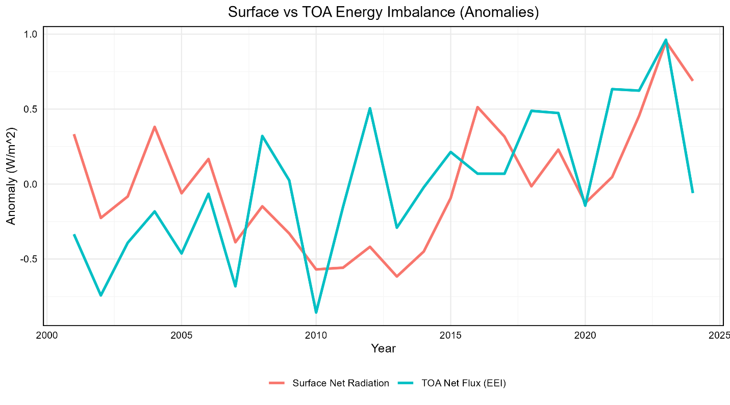 Figure 6 plots the latitude corrected means of both the TOA EEI and the net surface radiation (SW + LW) over the 2001-2024 period with CERES EBAF data after converting the net radiation flux values to anomalies from the respective means. I converted the net energy fluxes to anomalies because the magnitudes of the raw radiation fluxes are different due to the atmosphere.