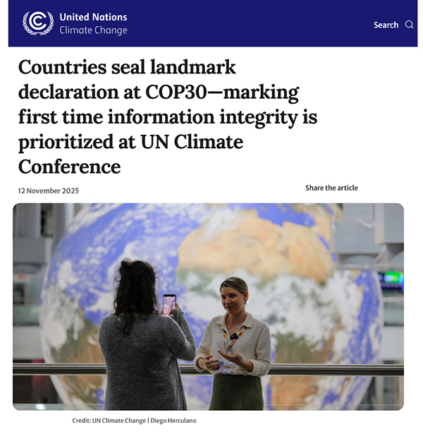 “We must fight mis- and disinformation, online harassment, and greenwashing,” said UN Secretary-General António Guterres in the lead-up to COP30. “Through the Global Initiative for Information Integrity on Climate Change, Governments and organizations are working together to fund research and action promoting information integrity on climate issues. Scientists and researchers should never fear telling the truth.”