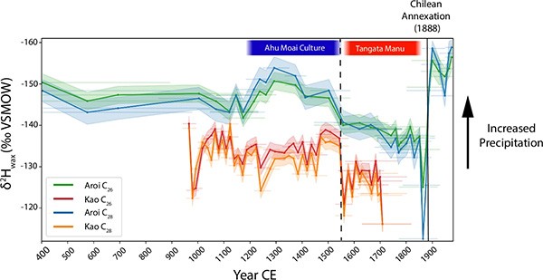 “We think leaf waxes on Rapa Nui are only recording information about local rainfall and aridity”, lead author Redmond Stein explained. By measuring the ratio of ‘heavy’ to ‘light’ hydrogen preserved in those waxes, the researchers reconstructed 800 years of rainfall history. The data shows that rainfall declined sharply in the mid-1500s and remained low for more than a hundred years.So rather than being the foolish people who built stone statues and chopped down every last tree, the people of Rapa Nui are a remarkable survival story.